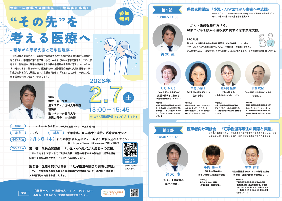 | 2部 | 「AYA世代のがん~ネットワークで支えるサバイバーシップ~」 「がん治療後の生殖医療」 「妊孕性温存療法における意思決定支援」 「千葉県小児・AYA世代のがん患者等の妊孕性温存療法研究促進事について」 |